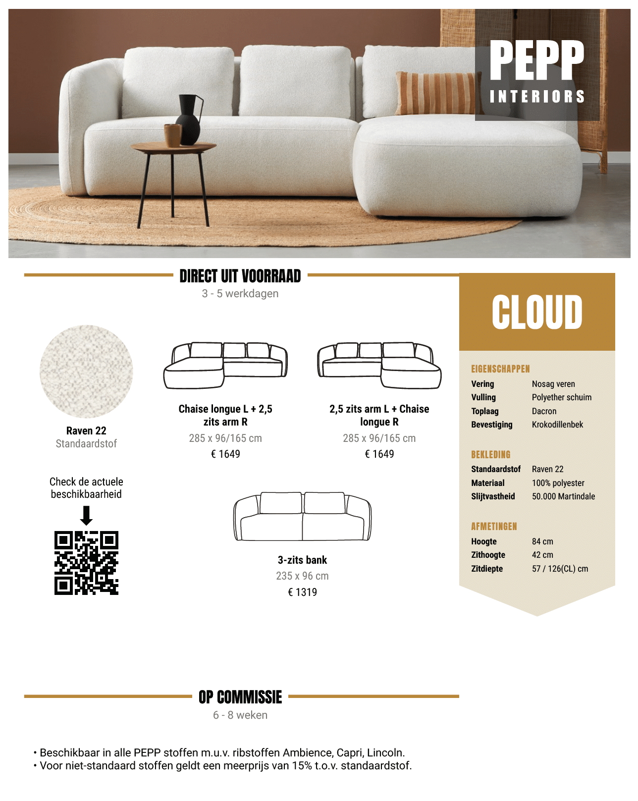 - Bank Cloud uit voorraad leverbaa in 2 opstellingen (Longchair links/Longchair rechts)