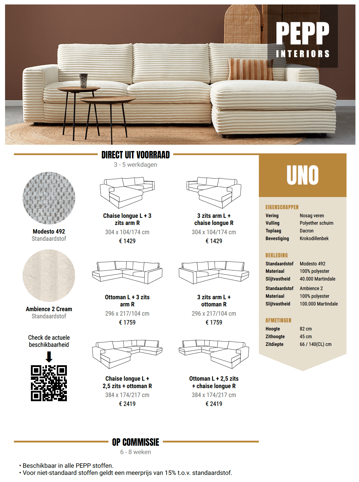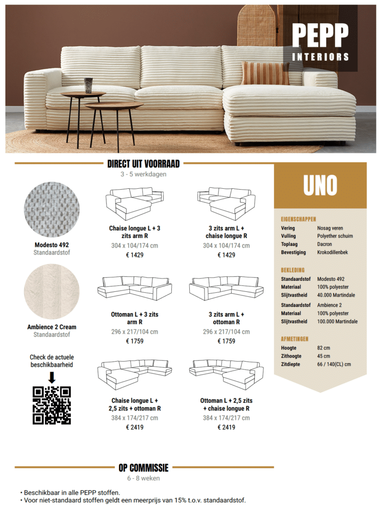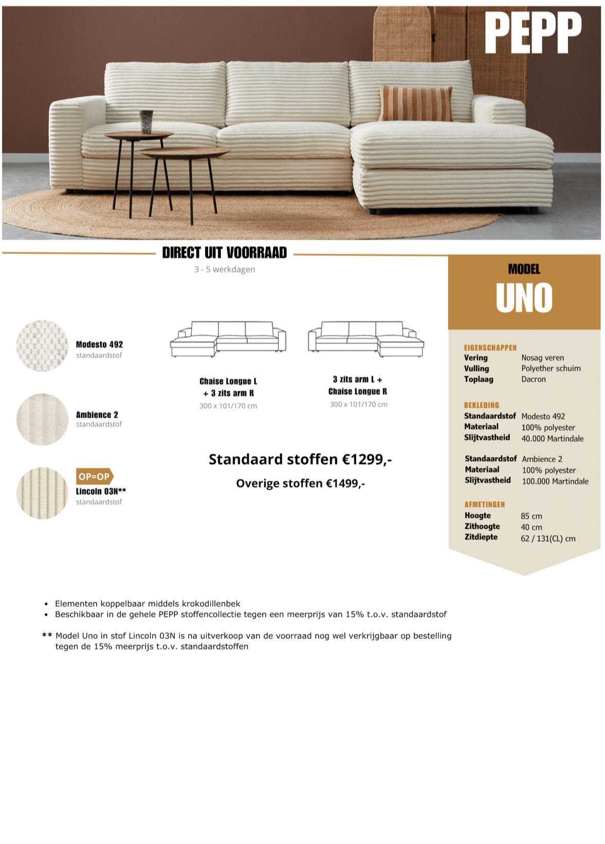 | Opzet | 3 zits arm L + Chaise Longue R, Chaise Longue L + 3 zits arm R |