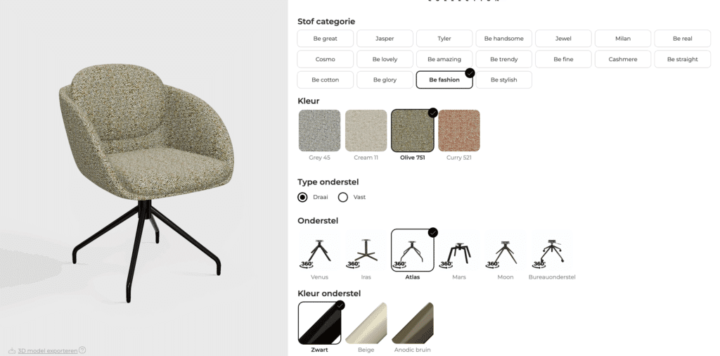 Ook het onderstel is beschikbaar in diverse modellen zoals Iras, Atlas, Mars, Moon of zelfs een bureaustoelonderstel – met kleurvariaties in zwart, beige en anodic bruin.