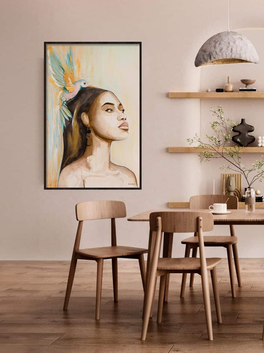 Een Flat on the wall ophangsysteem zorgt ervoor dat de afbeelding strak tegen de muur wordt gehangen.